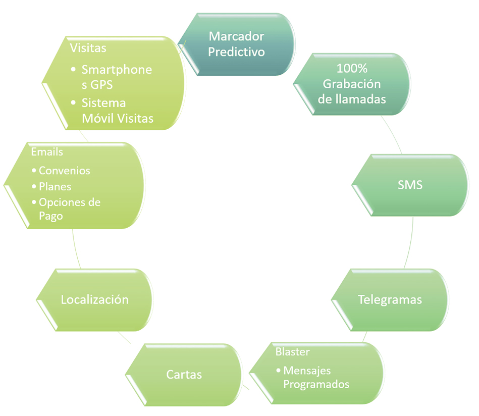 Los procesos para realizar la gestión de cobranza en el call center son planificados y enfocados en dar cumplimiento a los objetivos planteados, por lo que se considera necesario el desarrollar métodos y estrategias en las que se establezcan una serie de pasos y etapas ordenadas adecuadamente, dado que el propósito del diseño del proceso de cobranza es obtener el incremento en las recaudaciones y la disminución de pérdidas por cuentas por cobrar, brindando una atención integral de envíos Masivos de SMS, Via Whats App, Correos etc.. con la más alta tecnología aplicable como: